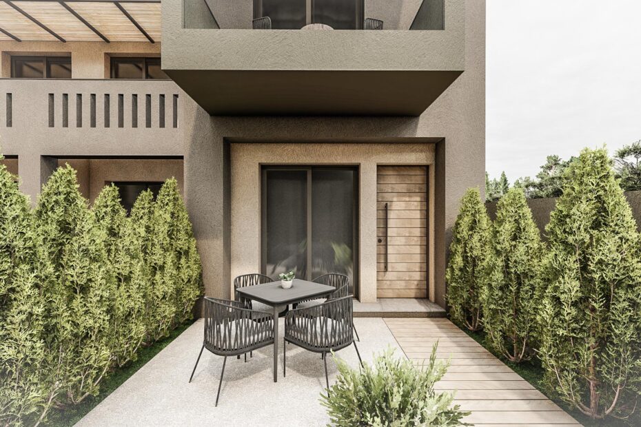 H κατοικία αποτελείται από ιδιωτικό κήπο  δύο, τρία υπνοδωμάτια, σαλόνι, κουζίνα, μπάνια, και άνετο μπαλκόνι.
