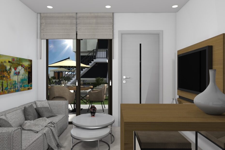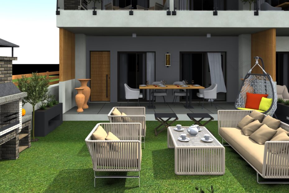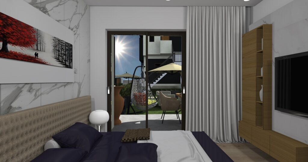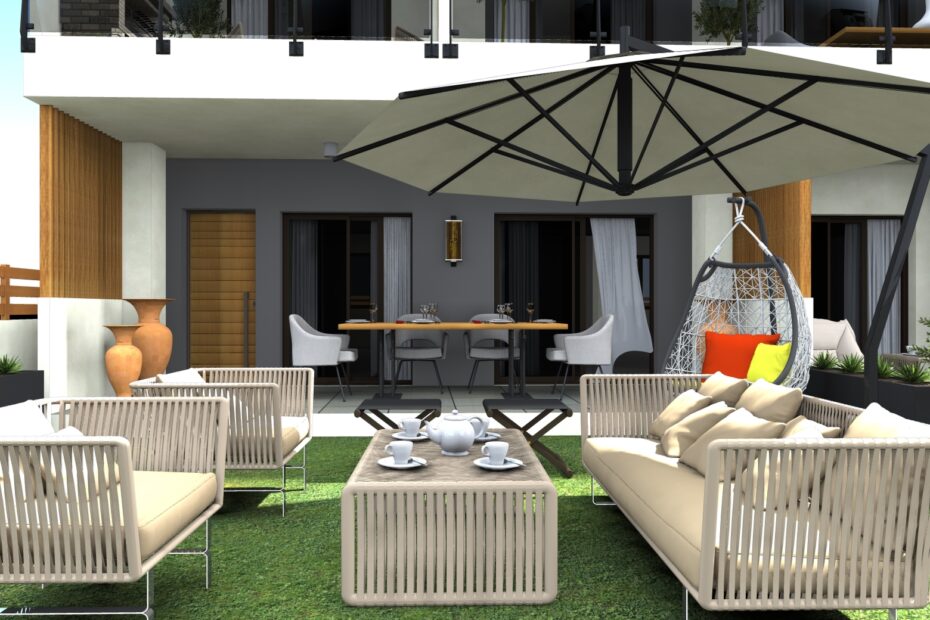 H κατοικία αποτελείται από ιδιωτικό κήπο 45τ.μ, δυο δωμάτια, σαλόνι, κουζίνα, μπάνιο και άνετα μπαλκόνια.